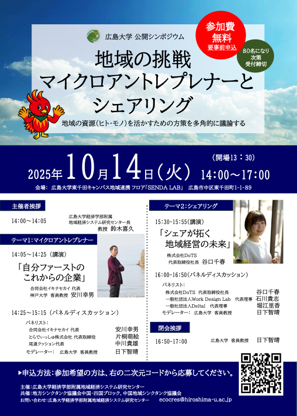 2025年10月14日に広島大学にて公開シンポジウム「地域の挑戦 マイクロアントレプレナーとシェアリング」が開催されました。