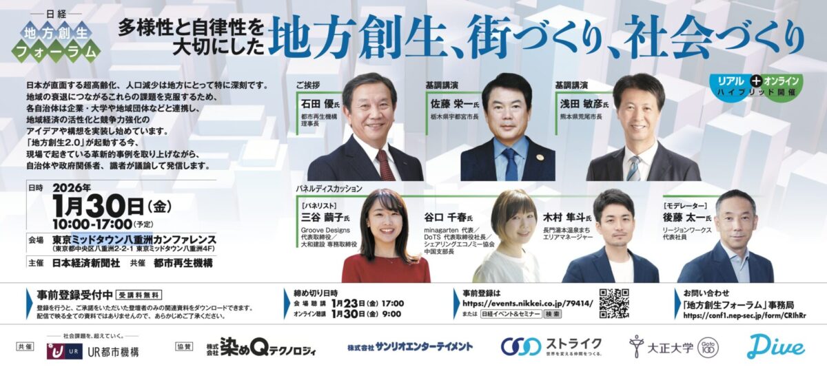 2026年1月30日(金)、日本経済新聞社が主催する「日経 地方創生フォーラム」が開催されます。 弊社代表の谷口千春は、14:20からのパネルディスカッションに登壇し、地域活性化に向けた官民連携やコミュニティの実装について議論に参加いたします。
