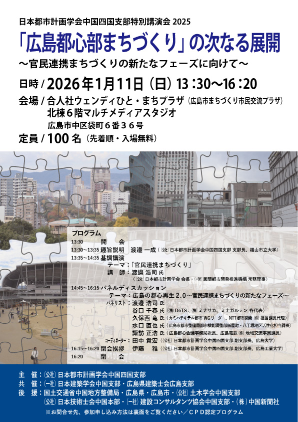 2026年1月11日に合人社ウェンディひと・まちプラザにて日本都市計画学会中国四国支部特別講演会 「広島都心部まちづくり」の次なる展開」が開催され、弊社谷口がパネリストとして登壇しました。
